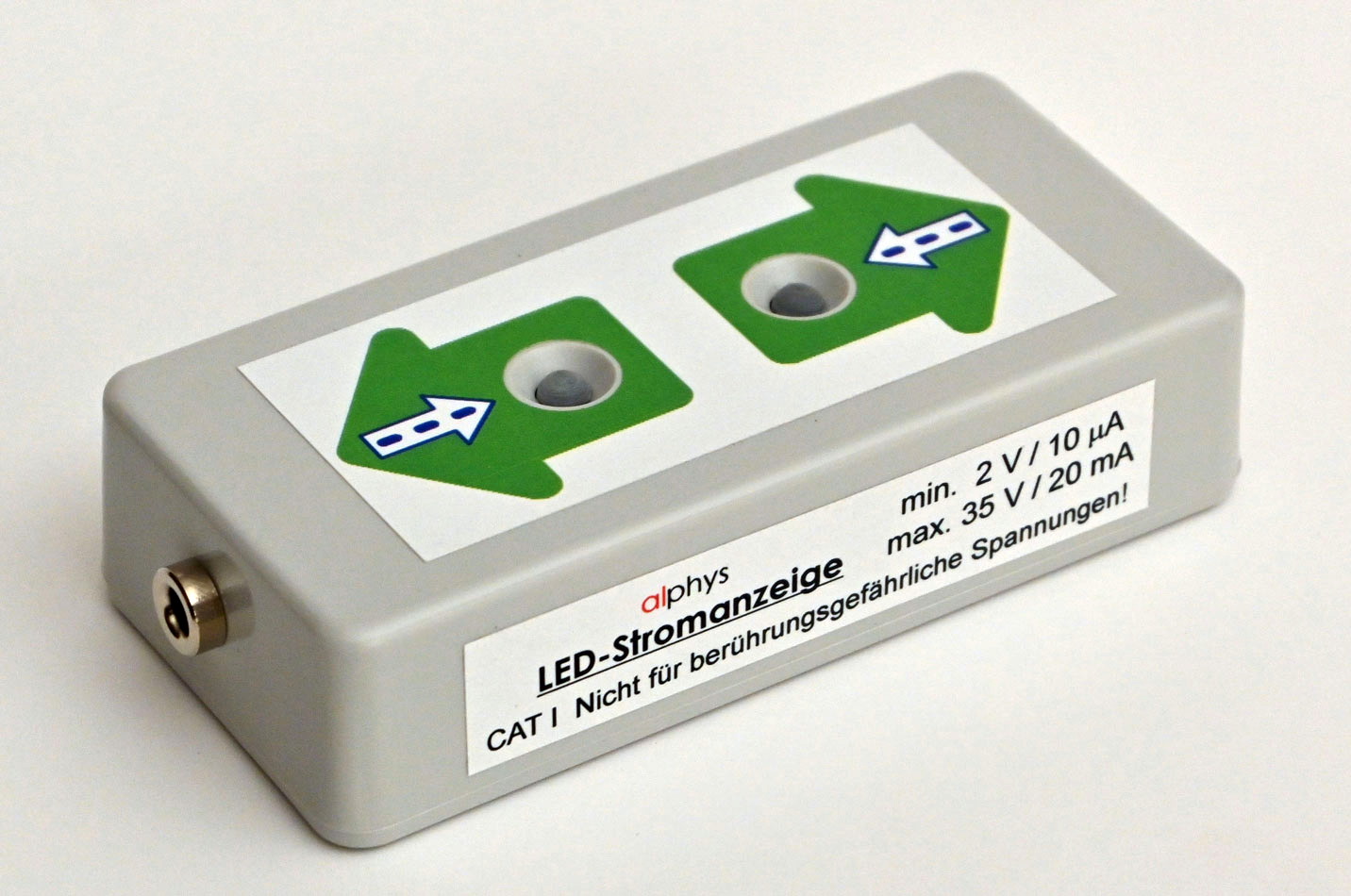 Zwei superhelle Leuchtdioden dienen zur empfindlichen und praktisch trägheitslosen Anzeige für elektrischen Stromfluss und dessen Richtung. Eine Stromstärke von wenigen Mikroampere erzeugt - ähnlich wie bei einer Glimmlampe - ein gut erkennbares Lichtsignal. Die erforderliche Spannung beträgt aber - anders als bei einer Glimmlampe - nur etwa 2 Volt. Damit können schwache, wechselnde elektrische Ströme, für die Glühlampen zu unempfindlich und Zeigerinstrumente zu träge sind, auf einfache Art qualitativ sichtbar gemacht werden. Unten sind Filmbeispiele dargestellt. Das Gerät enthält keine Batterie! Die großen Pfeile geben die ("technische") Stromrichtung an, die kleinen die Richtung der Elektronenbewegung. Durch die eingebauten Vorwiderstände tritt der maximale LED-Strom von 20 mA bei einer Spannung von 40 V auf. Die enthaltene Schutzschaltung verhindert auch bei elektrostatischen Experimenten zuverlässig eine Zerstörung der Leuchtdioden durch Entladestromspitzen.