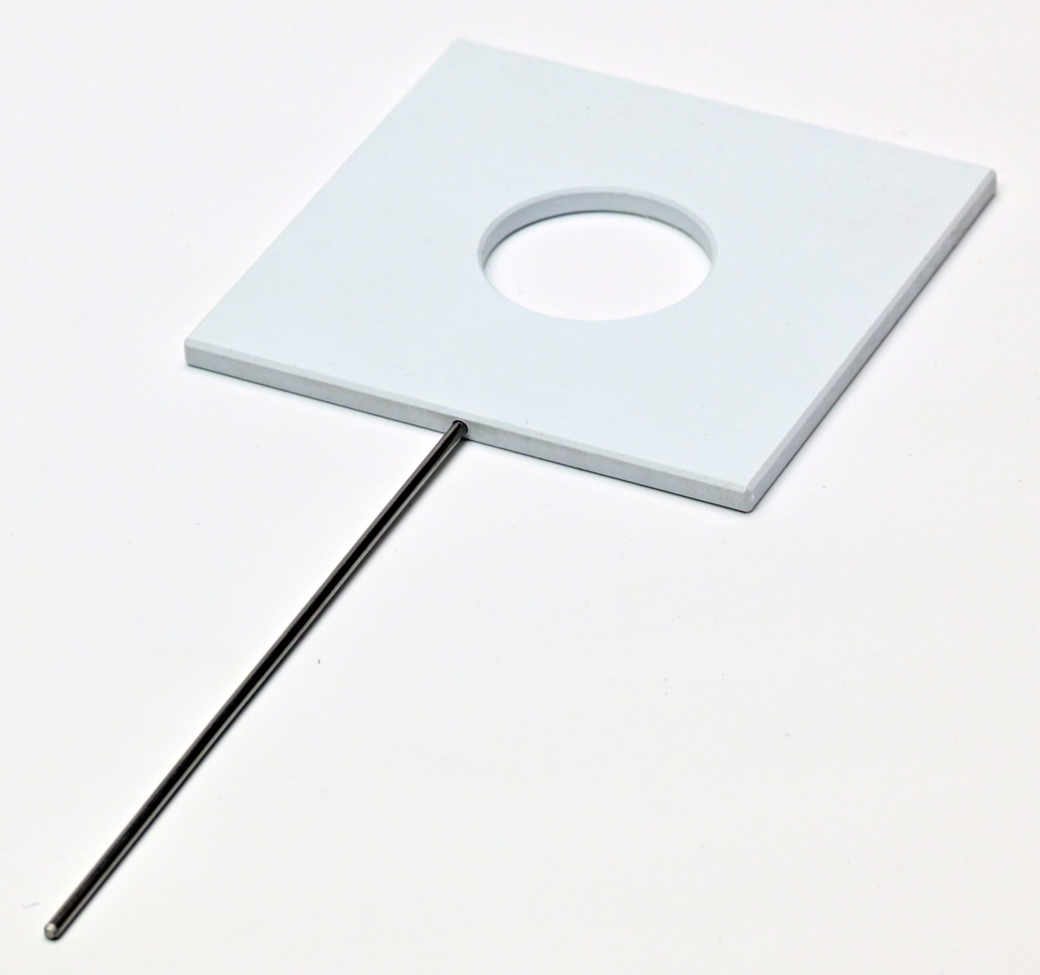 Eine hellgraue Kunststoffplatte mit einer Bohrung in der Mitte ist an einem dünnen Metallstiel befestigt. Durch Schattenprojektion dieses Körpers mit dem dreifarbigen LED-Strahler RGB (Art.Nr. 2030) kann man sowohl die additiven als auch die subtraktiven Grundfarben darstellen.