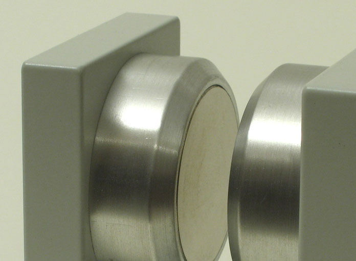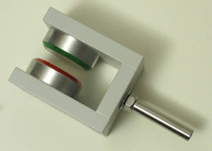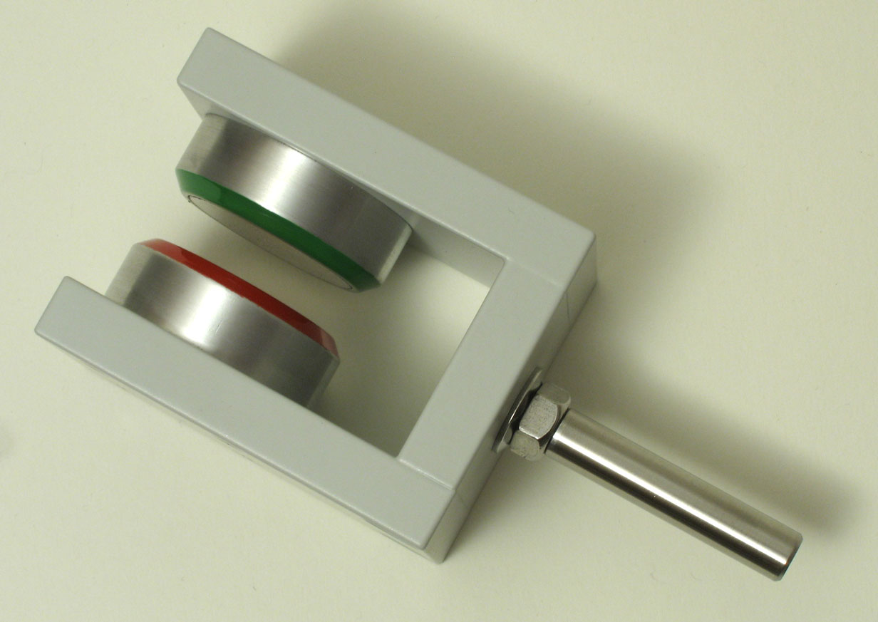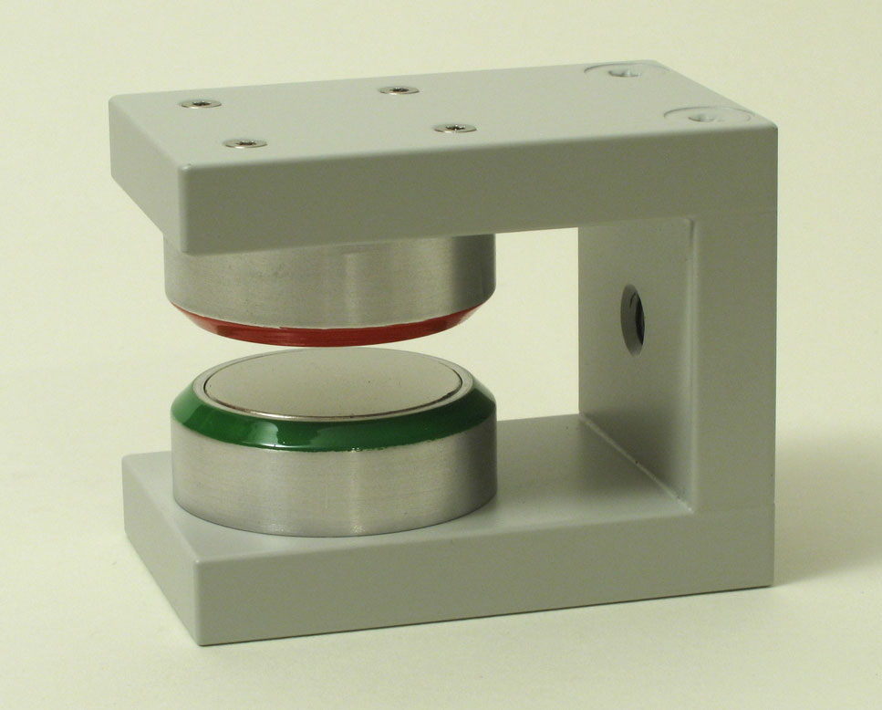 Zwei große, zylindrische Neodymmagnete in einem U-förmigen Eisenjoch erzeugen in einem großen und gut einsehbaren Luftspalt ein starkes und annähernd homogenes Magnetfeld. Die magnetische Flussdichte im Luftspalt beträgt etwa 0,9 Tesla. Zwei Aluringe fixieren und schützen die Magnete und sind mit Farbringen zur Polkennzeichnung markiert. Der U-Magnet ist auch ohne Polkennzeichnung lieferbar (siehe Foto). Das pulverbeschichtete Joch ist im Mittelteil mit einer Gewindebohrung M8 versehen. Ein passender Gewindebolzen aus Edelstahl wird mitgeliefert.