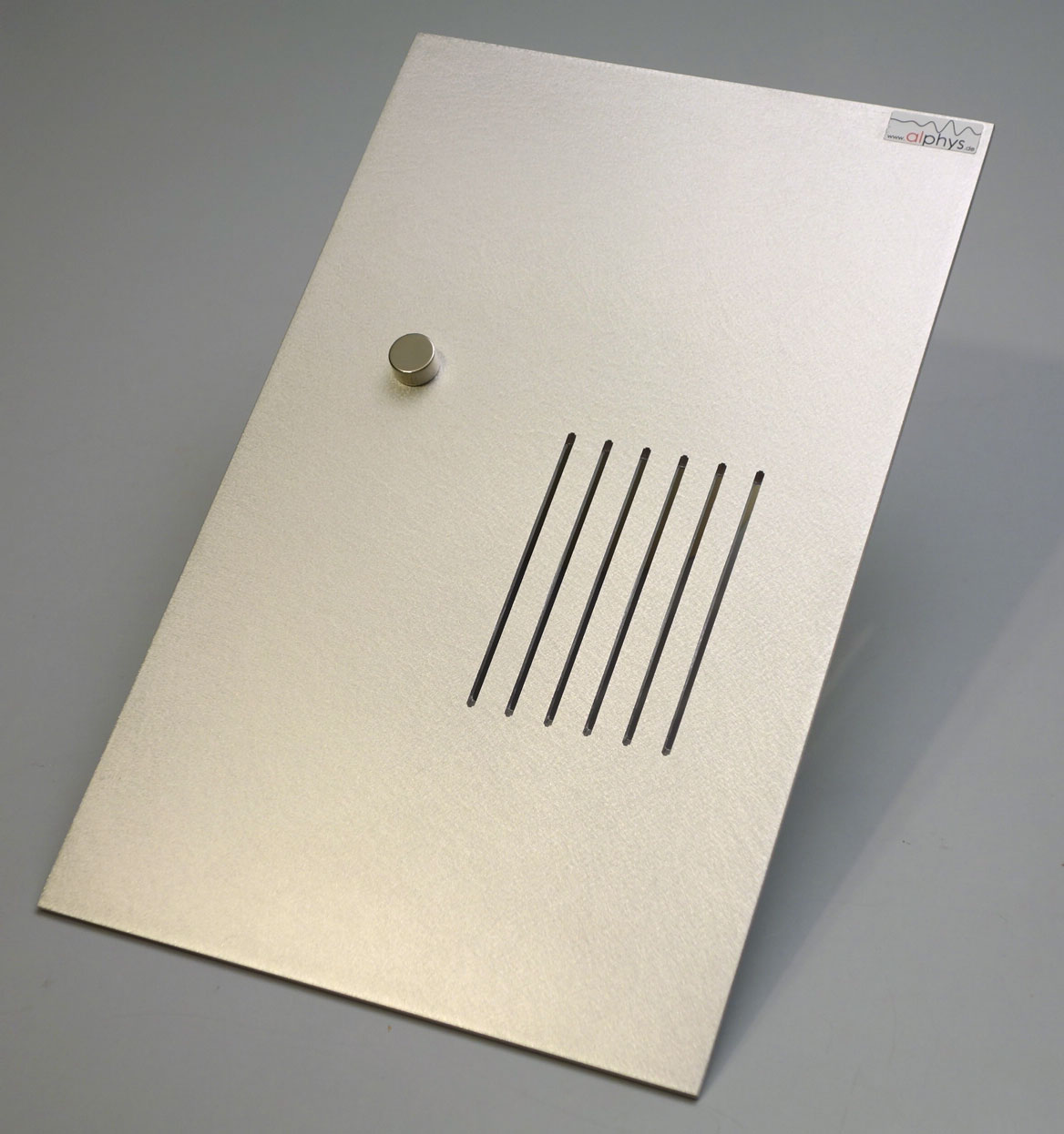 Eine Aluplatte, über die ein Neodymmagnet gleitet, ermöglicht die direkte Beobachtung der Bremswirkung durch die induzierten Wirbelströme. Die Bremskräfte sind auch deutlich fühlbar. An den eingefrästen Schlitzen sind die Wirbelstrompfade unterbrochen, dadurch ist die Bremswirkung dort wesentlich geringer. Die 3 mm dicke Platte besteht aus Reinaluminium wegen des sehr geringen spezifischen Widerstandes dieses Werkstoffes. Die Oberfläche ist geschliffen. Zwei passende Neodymmagnete (Ø15mm x 8 mm, N42, vernickelt) sind im Lieferumfang enthalten. Bitte beachten Sie die Hinweise zum Umgang mit Nd-Magneten. Eine einfache Erklärung und Darstellung der Wirbelströme finden Sie hier.
