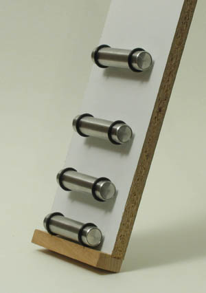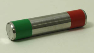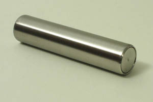 In einem zylindrischen Gehäuse aus einer Edelstahllegierung (nahezu unmagnetisch) ist eine Reihe starker Neodymmagnete eingekapselt. Die Hülle ist stabil genug, um jeden Sturz vom Tisch und jede magnetische Kollision schadlos zu überstehen. Die Dicke der Hülle ist so ausgelegt, dass schmerzhafte Quetschungen durch Magnetkräfte (z.B. zwischen zwei Stabmagneten) weitgehend ausgeschlossen sind. Das kräftige Magnetfeld in der Umgebung ist für viele Experimente nutzbar (z.B. Ausrichtung einer Kompassnadel im Erdfeld aus 50 cm Abstand). Der Stabmagnet ist mit farbiger Polkennzeichnung lieferbar. Für Rollversuche oder Kräftebeobachtung an einer schiefen Ebene (siehe Foto) sind passende Gummiringe im Lieferumfang.